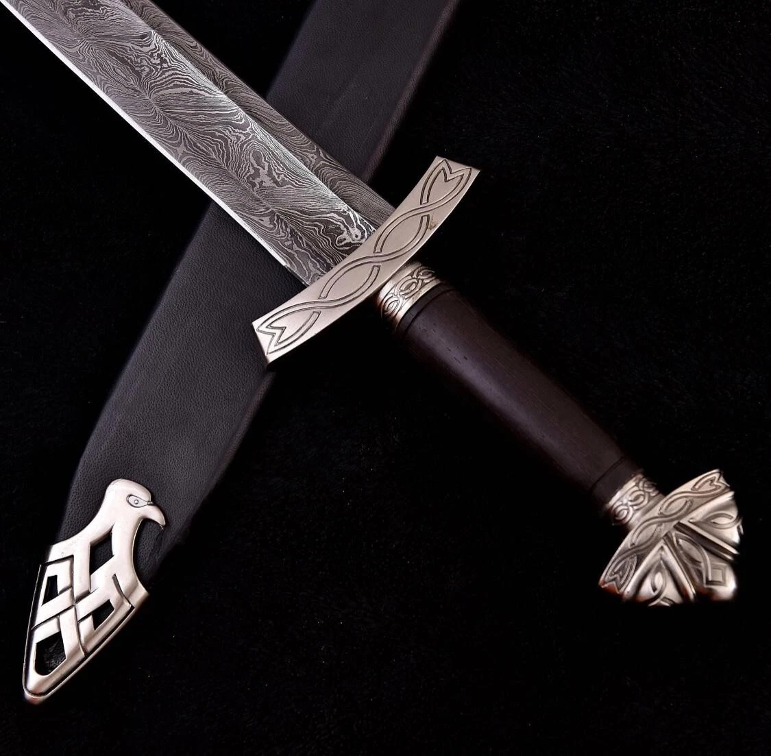 Hand-forged Viking sword in Damascus steel — a legacy of Norse strength and craftsmanship.